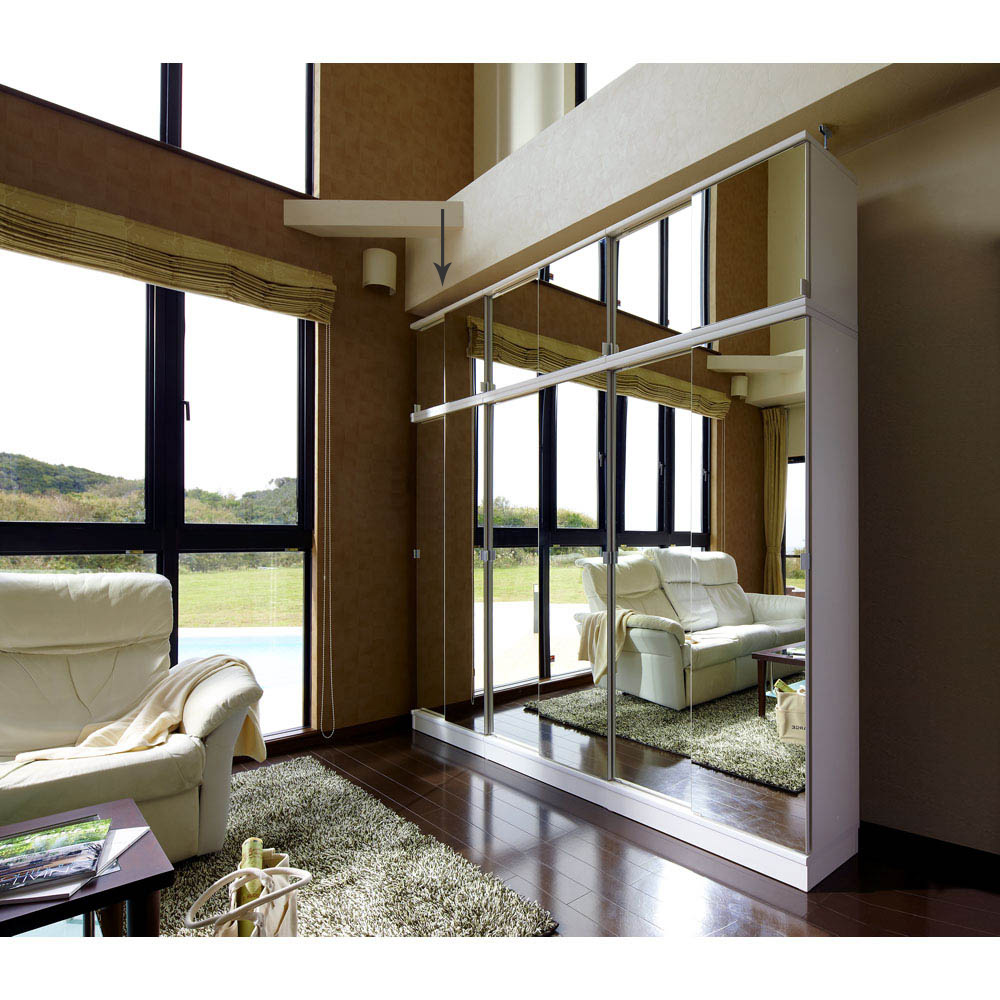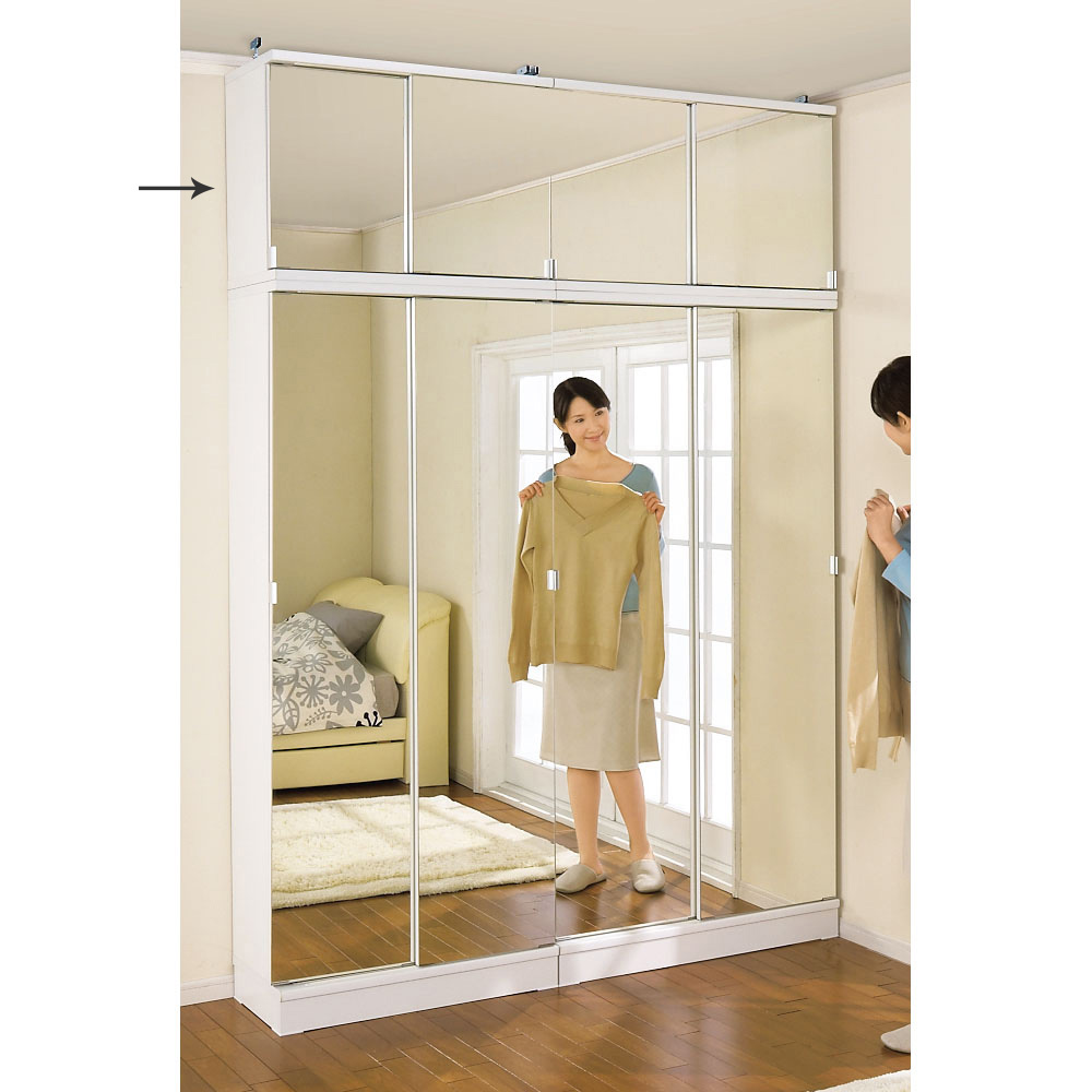 突っ張り上置きとの設置例 幅が同じサイズであれば、ミラー扉と板扉は組み合わせ可能です。写真はミラータイプの本体と板扉の上置きとの設置例です。