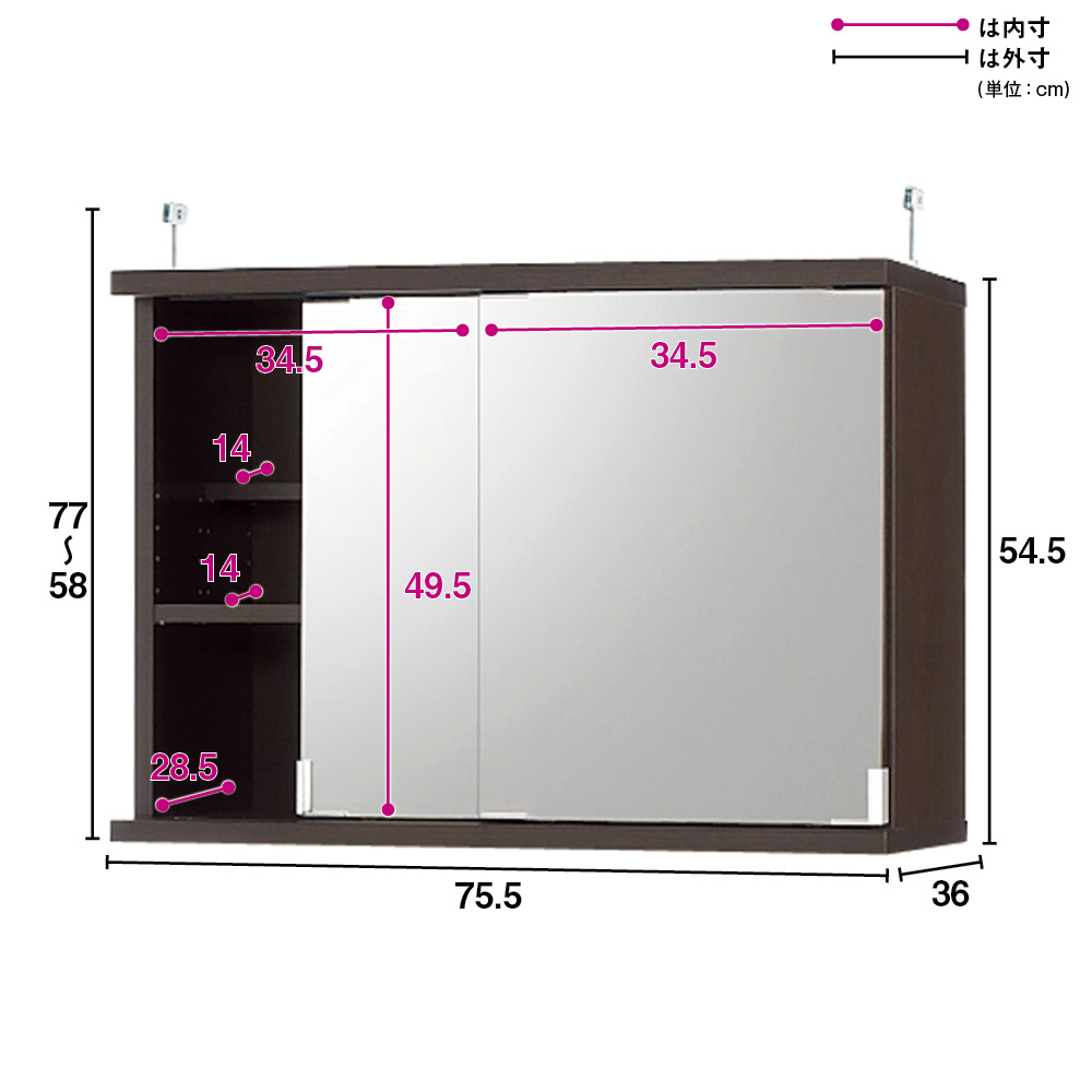 ■サイズ:幅75.5奥行36高さ54.5・重さ15kg、上置き設置時の天井対応高さ238~257cm