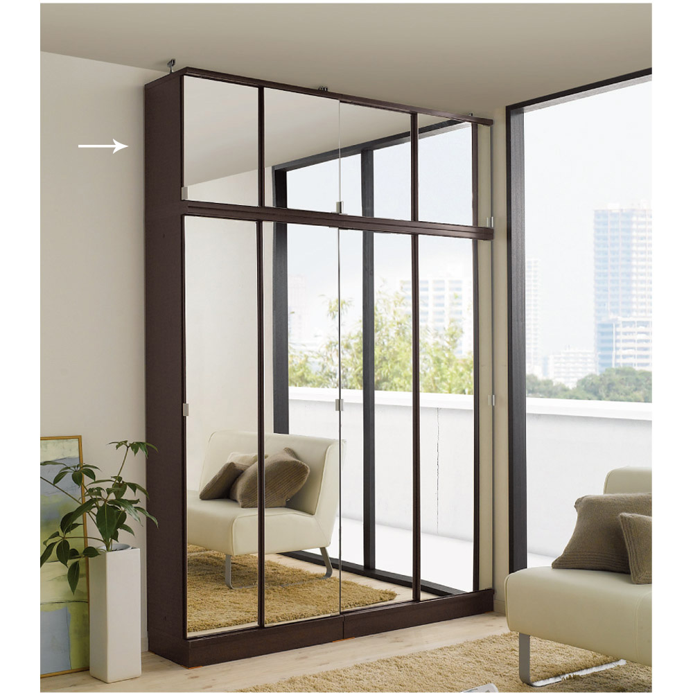 (イ)ダークブラウン≪組合せ例≫ ※お届けは引き戸タイプミラー扉上置き幅75cmです。 写真は、ミラー扉高さ180cm(幅75cm、90cm)とミラー扉上置き(幅75cm、90cm)の組み合わせ例です。