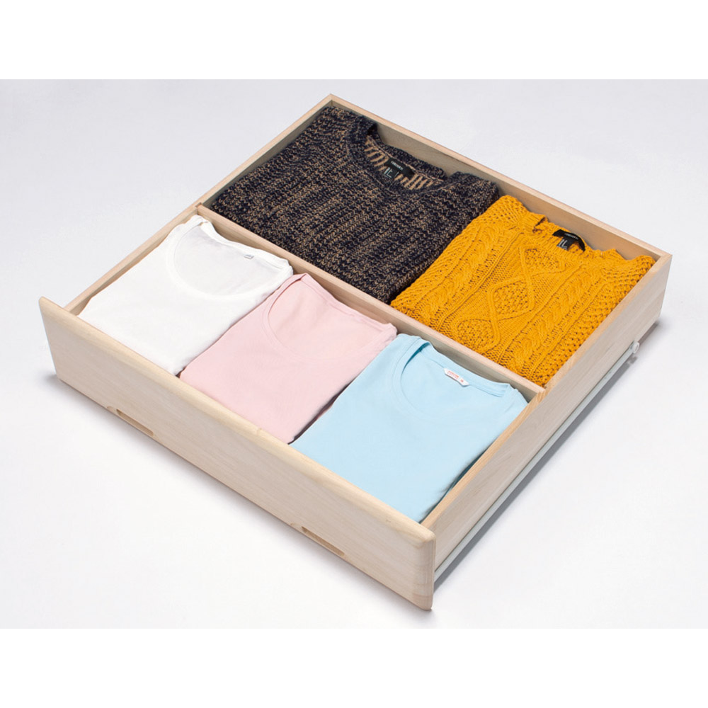 • 引き出しの手前にシーズン物を入れ、仕切り板の奥にオフシーズンの衣類をしまうと便利です。