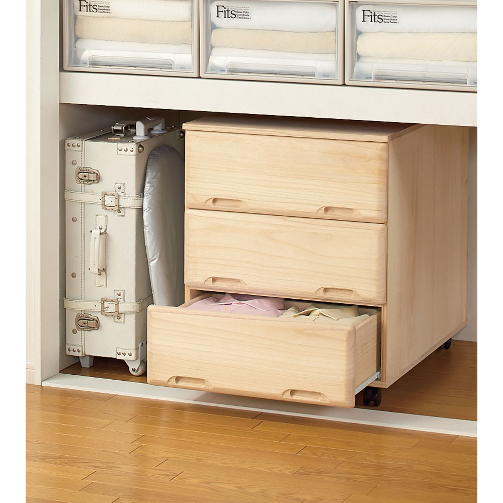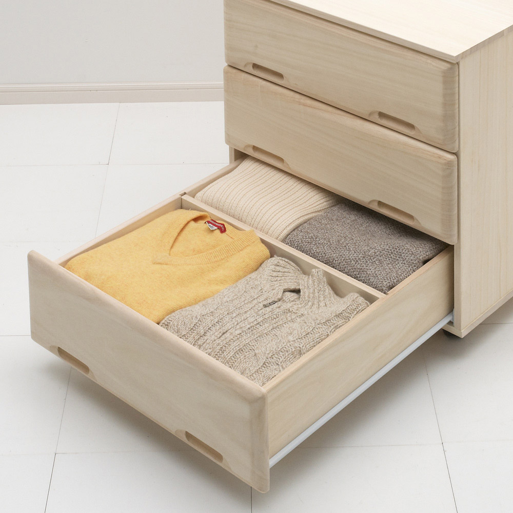 引き出しの手前にシーズン物を入れ、仕切り板の奥にオフシーズンの衣類をしまうと便利です。 ※写真は幅75.5cmタイプです。
