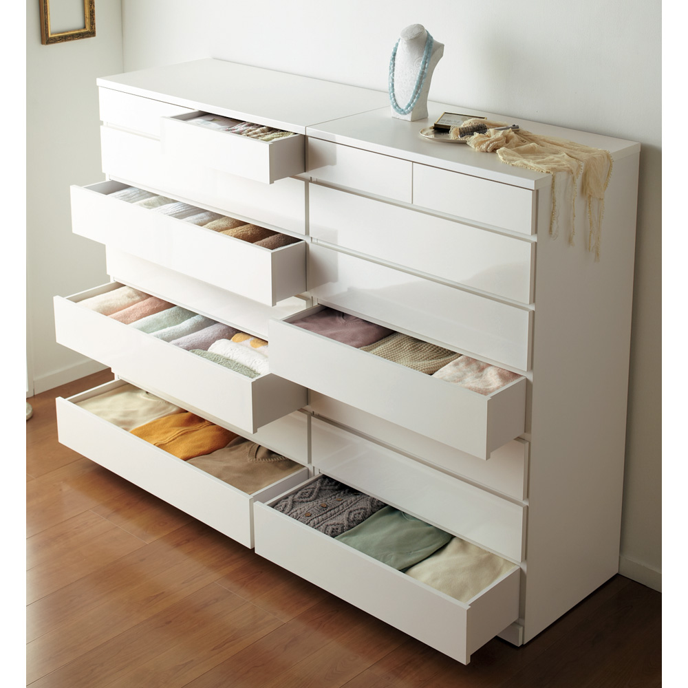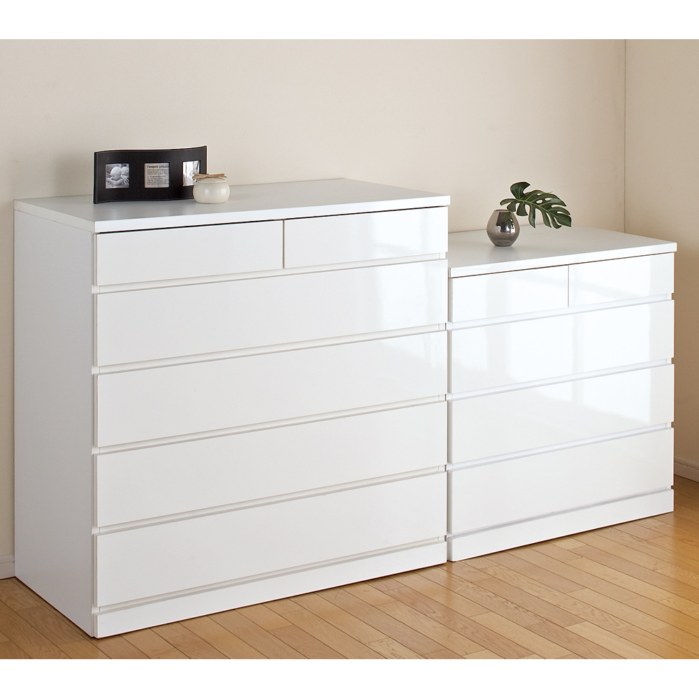 奥行たっぷり50cmのチェストタンスです。ホワイトは高級感がある光沢仕上げで、汚れてもお手入れが簡単。