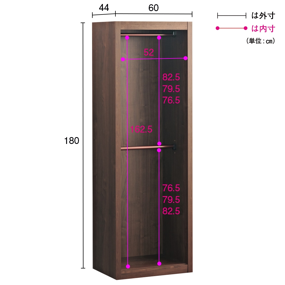 ■収納部[有効内寸]:(上段ハンガー部)幅52cm奥行40cm高さ76.5cm・79.5cm・82.5cm(下段パイプを取り外した時の高さ162.5cm)