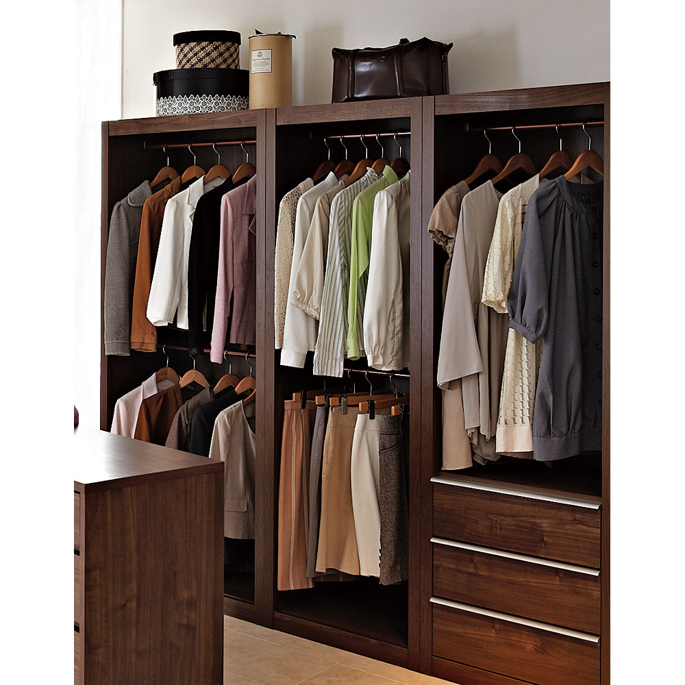 ■シリーズには、ロングコートやワンピースを掛けるもの、ジャケットやスカートを収納するもの、引き出しがたくさん付いたものや、バッグが収納できるものなど多彩なバリエーションをご用意。■手持ちの衣類のボリュームに合わせて組み合わせることで、海外インテリアのようなワードローブが完成します。