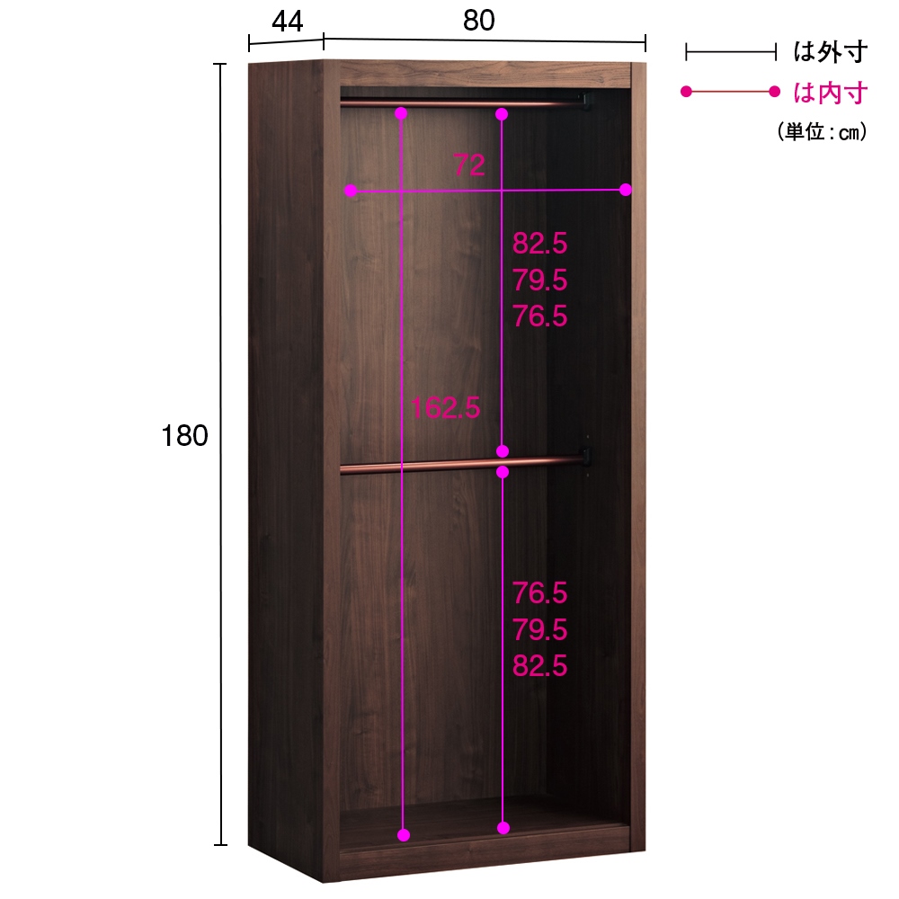 ■収納部[有効内寸]:(上段ハンガー部)幅72cm奥行40cm高さ76.5cm・79.5cm・82.5cm(下段パイプを取り外した時の高さ162.5cm)