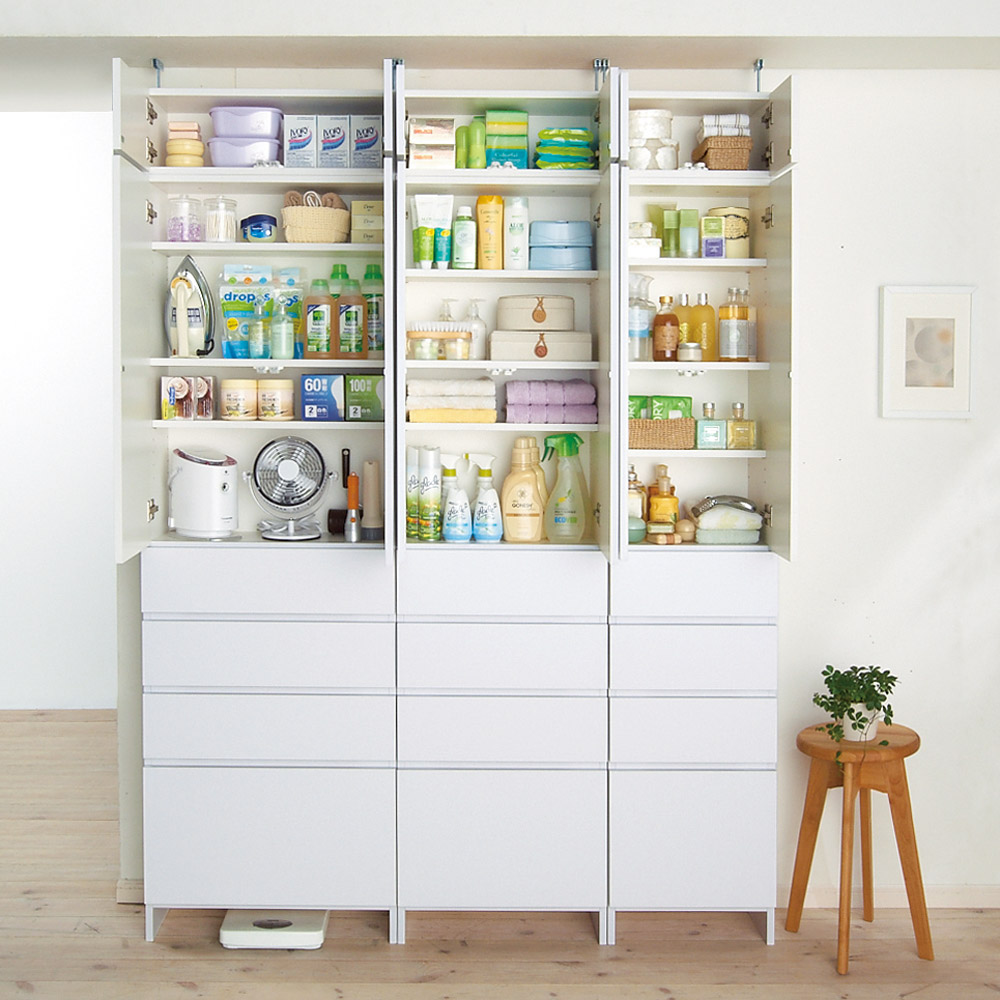 ●下部は収納場所に困るタオル収納や衣類収納に便利な引き出しチェスト。●上部は洗剤などの洗濯用品や化粧品のストックに便利な棚です。