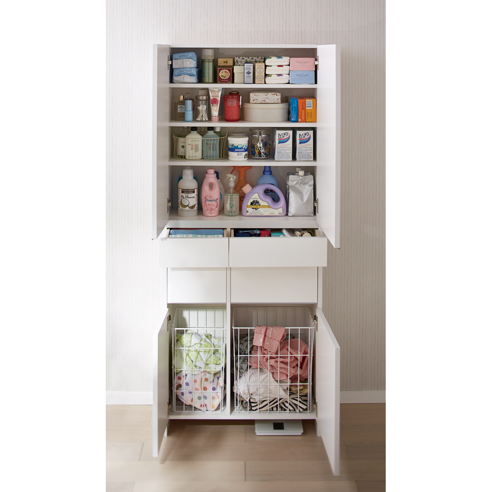 洗濯かごとサニタリーチェストが1台になった清潔感あふれるアイデア洗面所収納です。 ※足元には高さ8cmのすき間があり、ヘルスメーターが入ります。