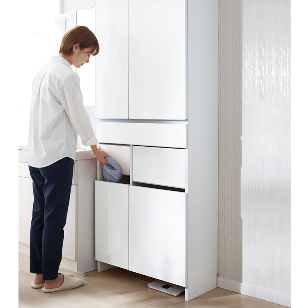• 脱衣カゴを中に収納することで生活感を隠せます。 ※写真は幅73cm・ハイタイプです。