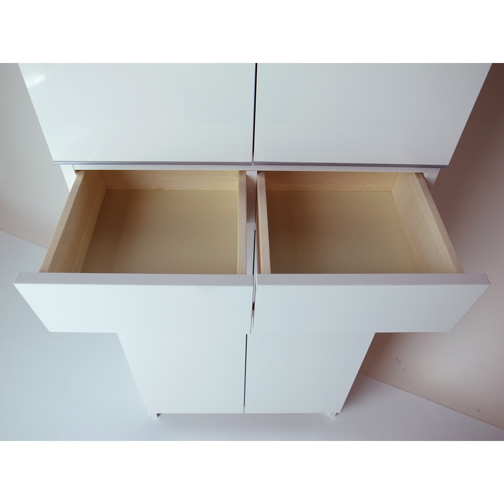 • 前面はサニタリー収納やランドリー収納にぴったりな美しい光沢仕上げ。汚れもサッと拭き取れます。