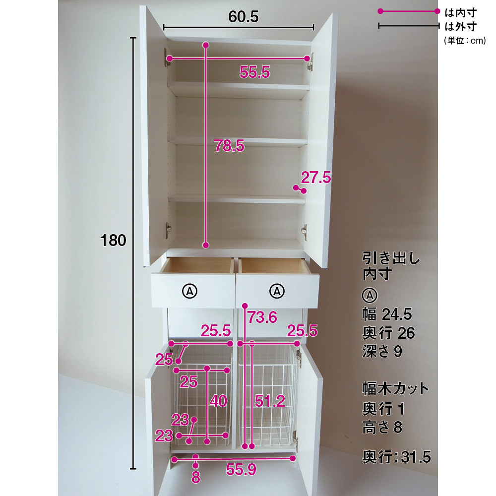 ■扉収納部内寸:幅55.5奥行27.5高さ78.5cm