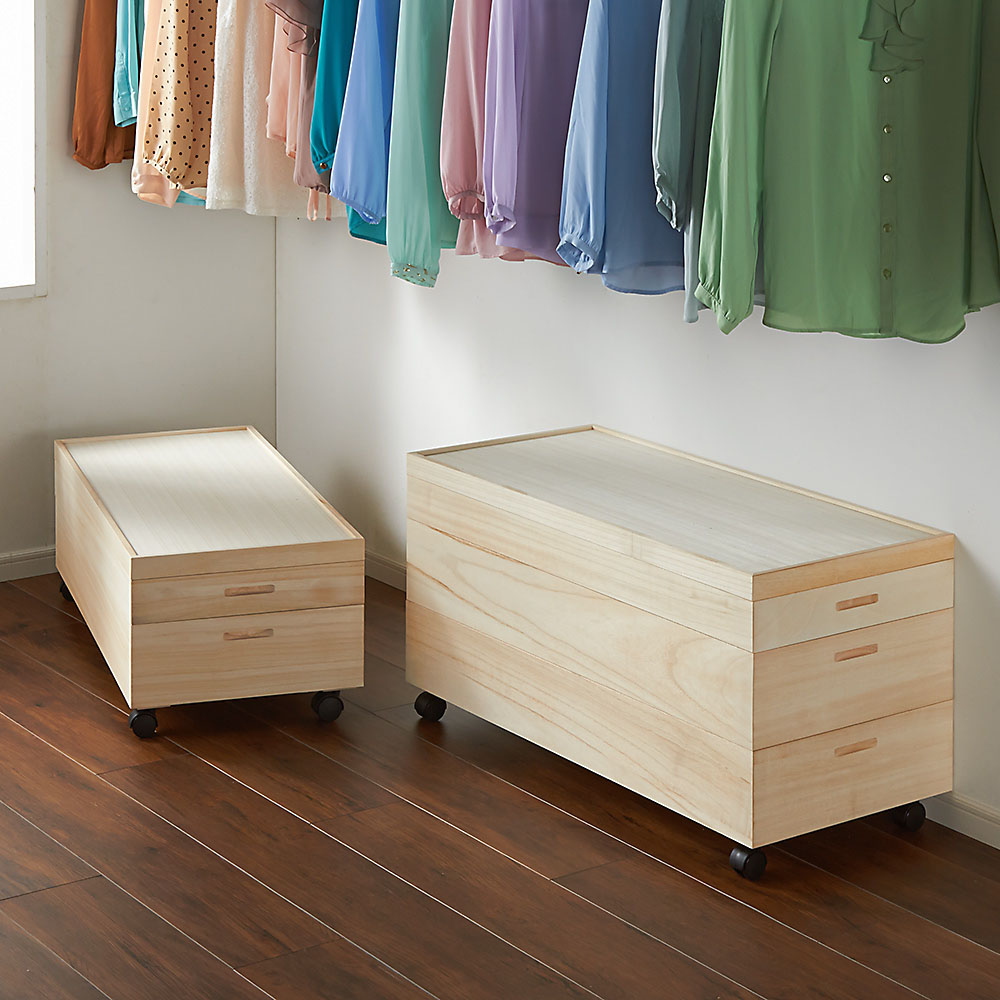 着物やカシミヤ等、大切な衣類の保管には桐収納がおすすめ。桐は古くから日本の四季に適した材として、箪笥などによく使われている素材です。