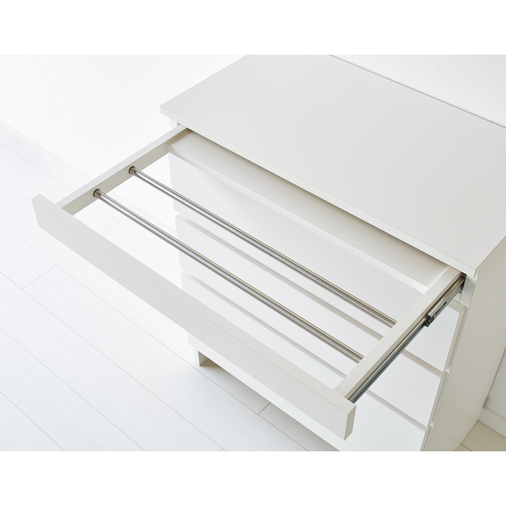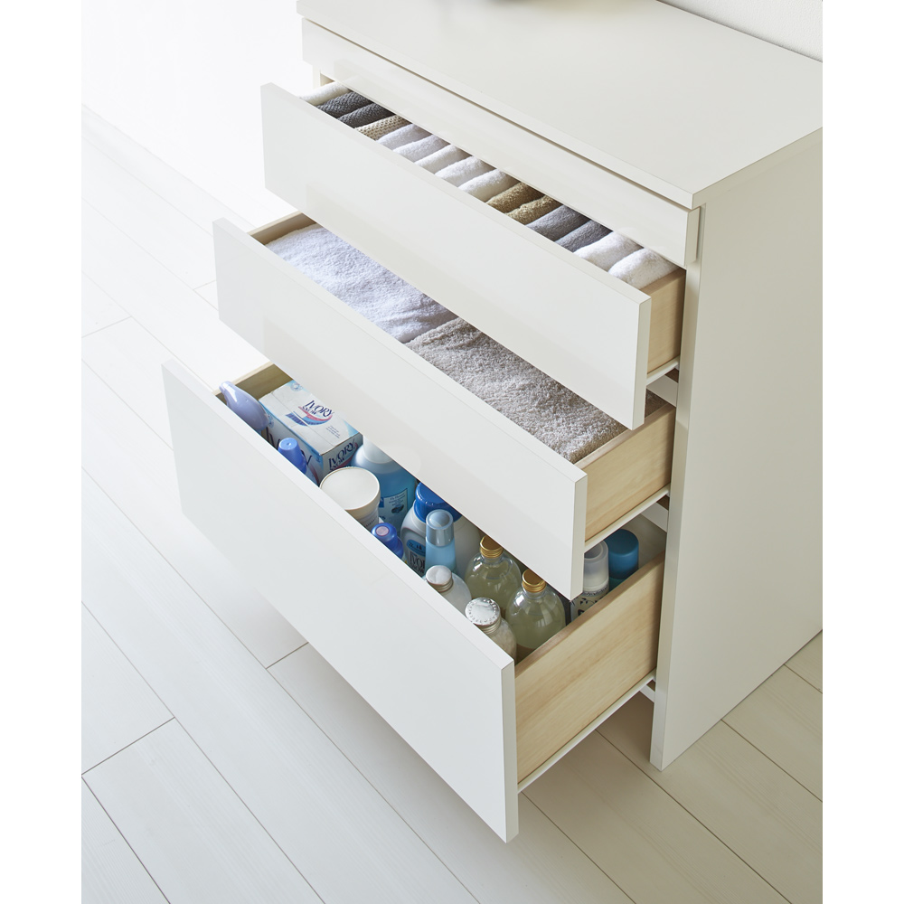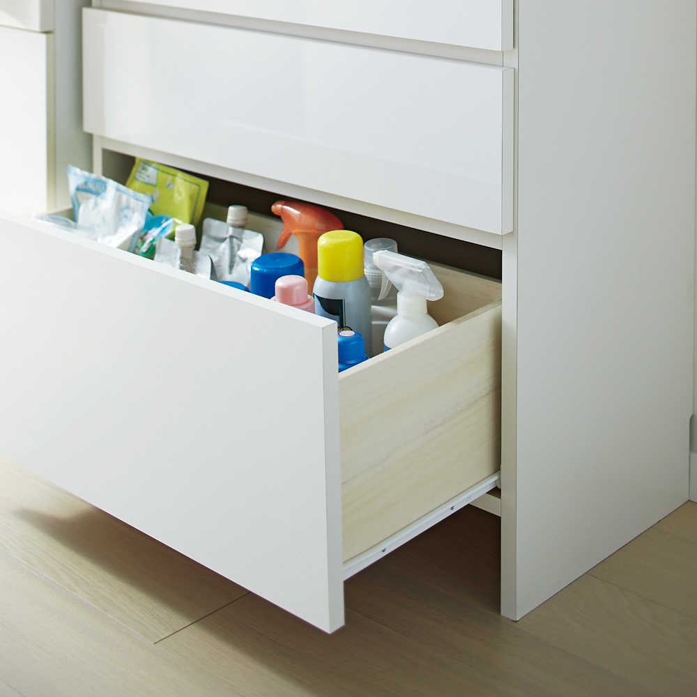 ●全段スライドレール付きで、物をたくさん入れて重たくなってもスムーズに引き出すことができます。●一番下の引き出しは深くなっているので、背の高い柔軟剤ボトルや掃除用具の収納にもぴったりです。