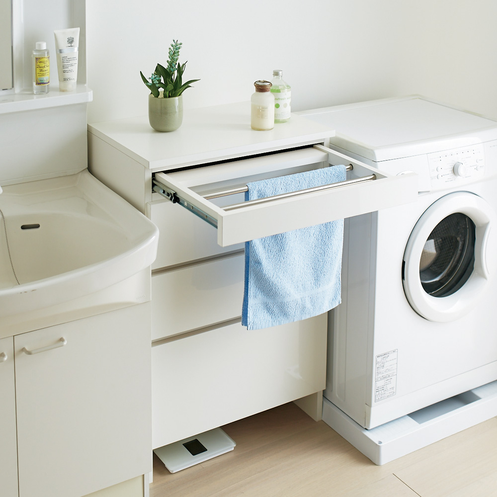 ●上部格納されたハンガーバーは、必要な時にさっと引き出して使えます。●タオルをかけたり、バスマットを干したり…便利な2本のバーが快適な洗面タイムをサポートします。
