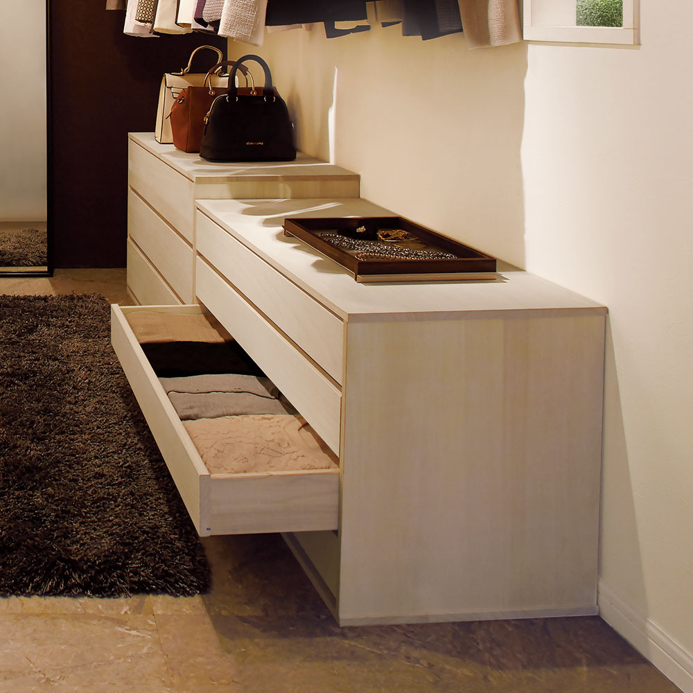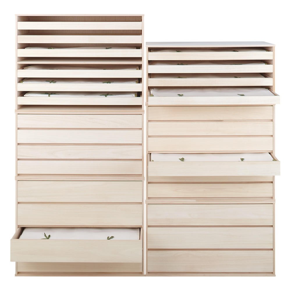 ※お好みで3段まで積み重ねが可能です。但し、「盆収納」や「バッグ収納」の上に「引き出し」は載せられません。。
