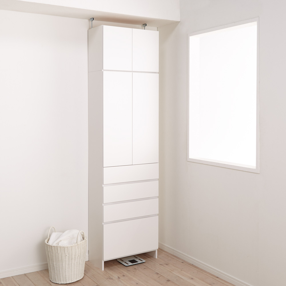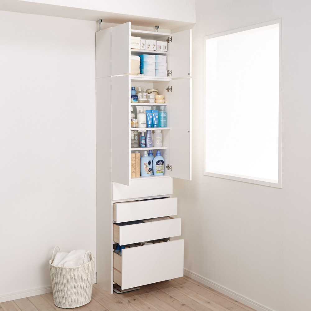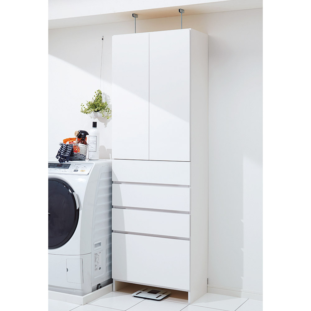 コーディネート例 狭い洗面所や脱衣所に置ける、見た目すっきりの薄型&天井突っ張りタイプ。(※写真は奥行23.5cmタイプ)