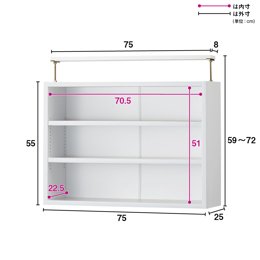 ■サイズ:幅75奥行25高さ59~72cm、上置き設置時の天井対応高さ239~252cm