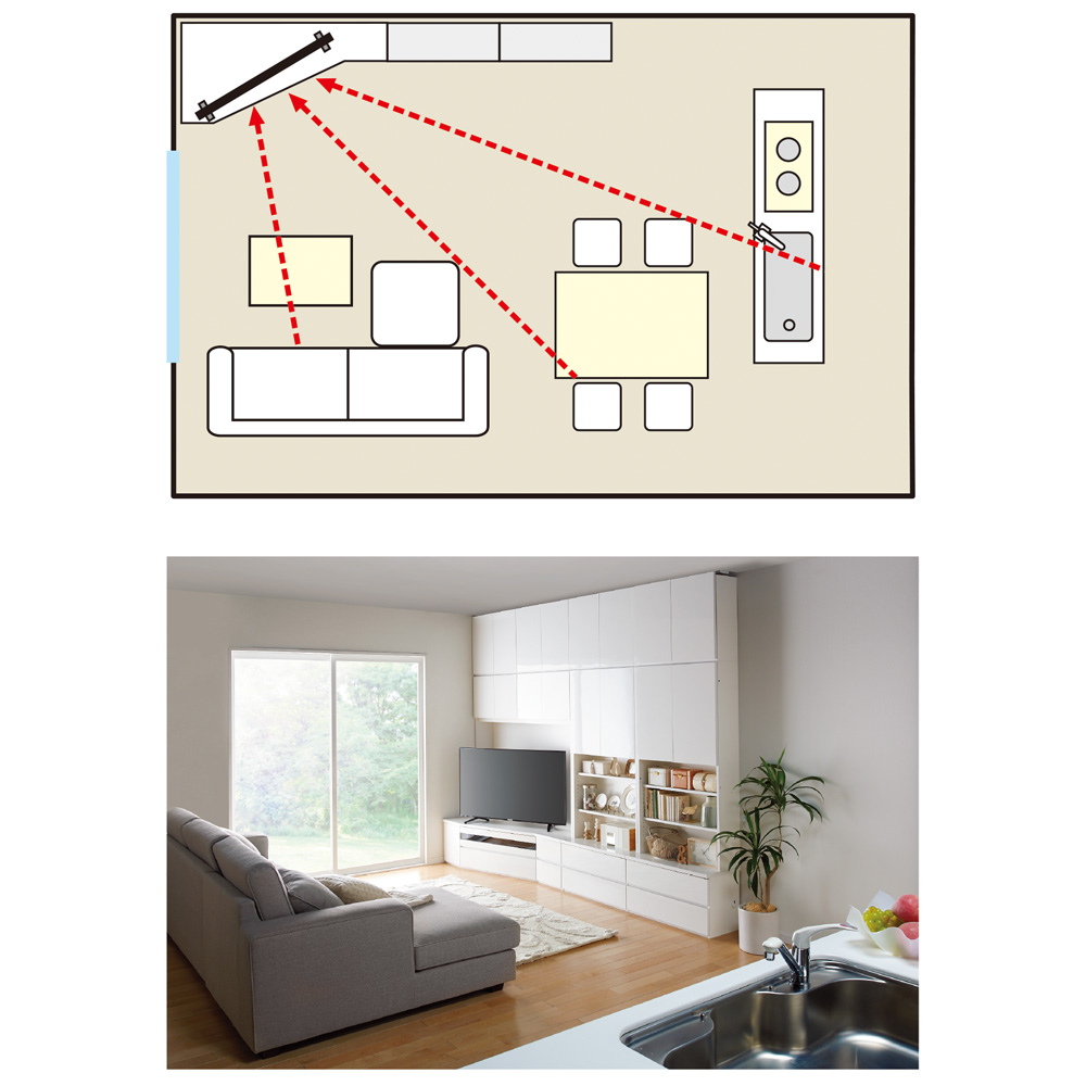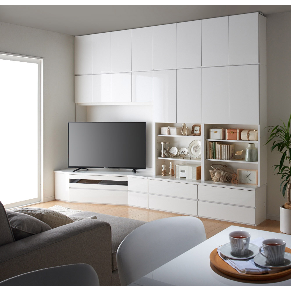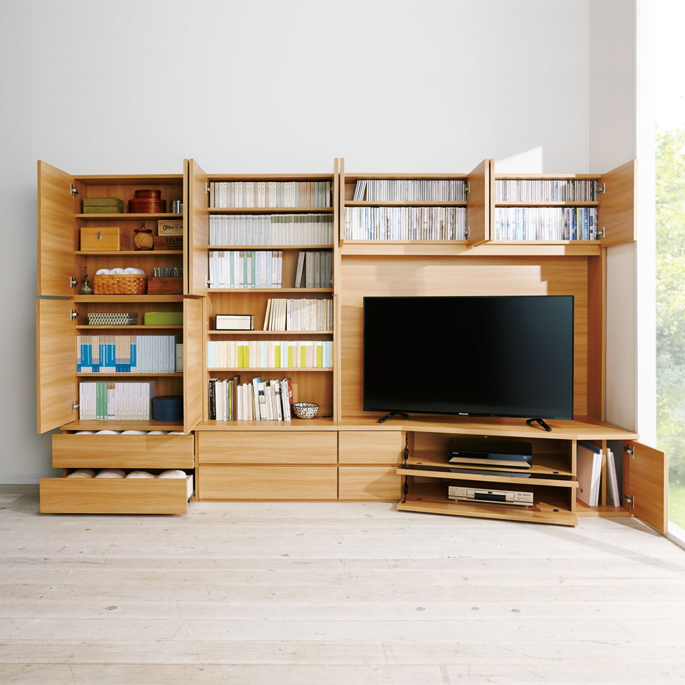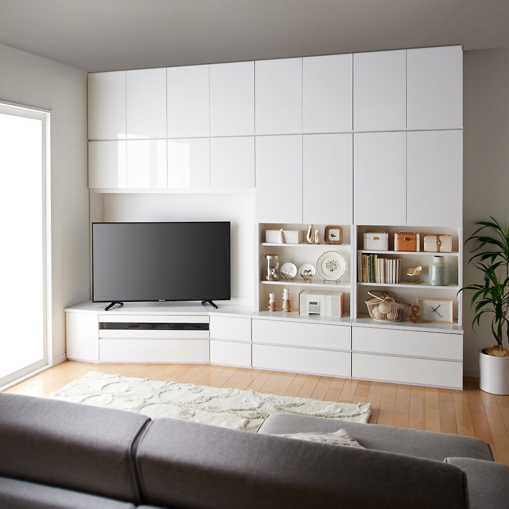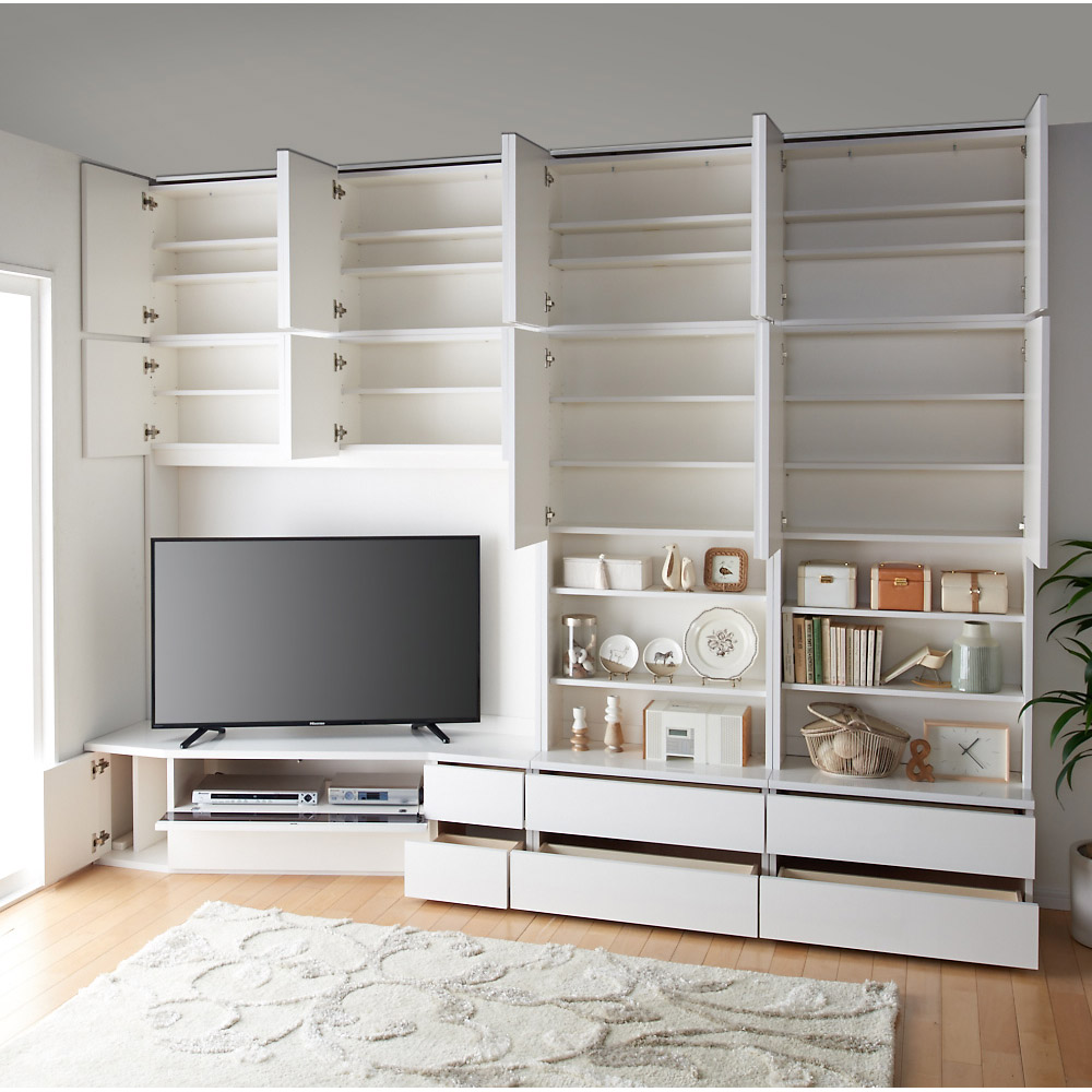 部屋のどこいてもテレビが見やすいコーナーテレビ台を中心とした壁面収納シリーズ。
