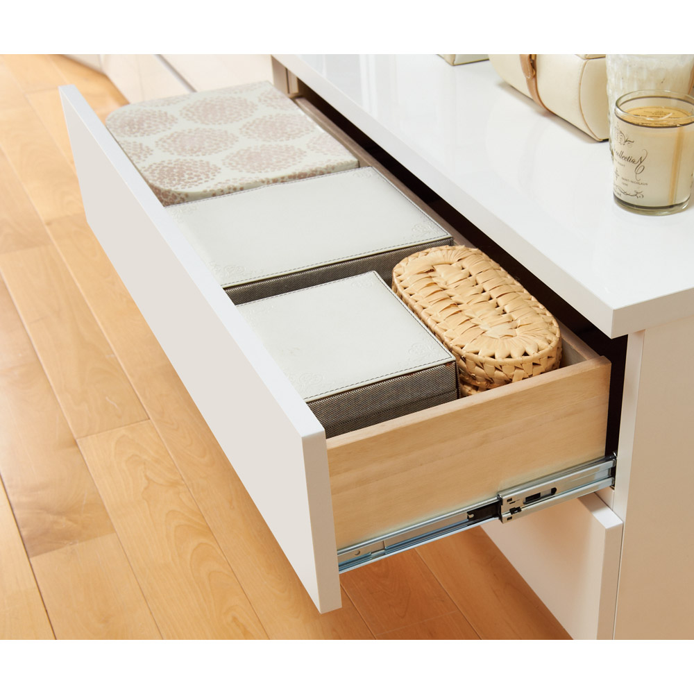 引き出し収納は、フルスライドレール装着で全開OK。軽い力で引き出せ奥の物まで出し入れが簡単です。