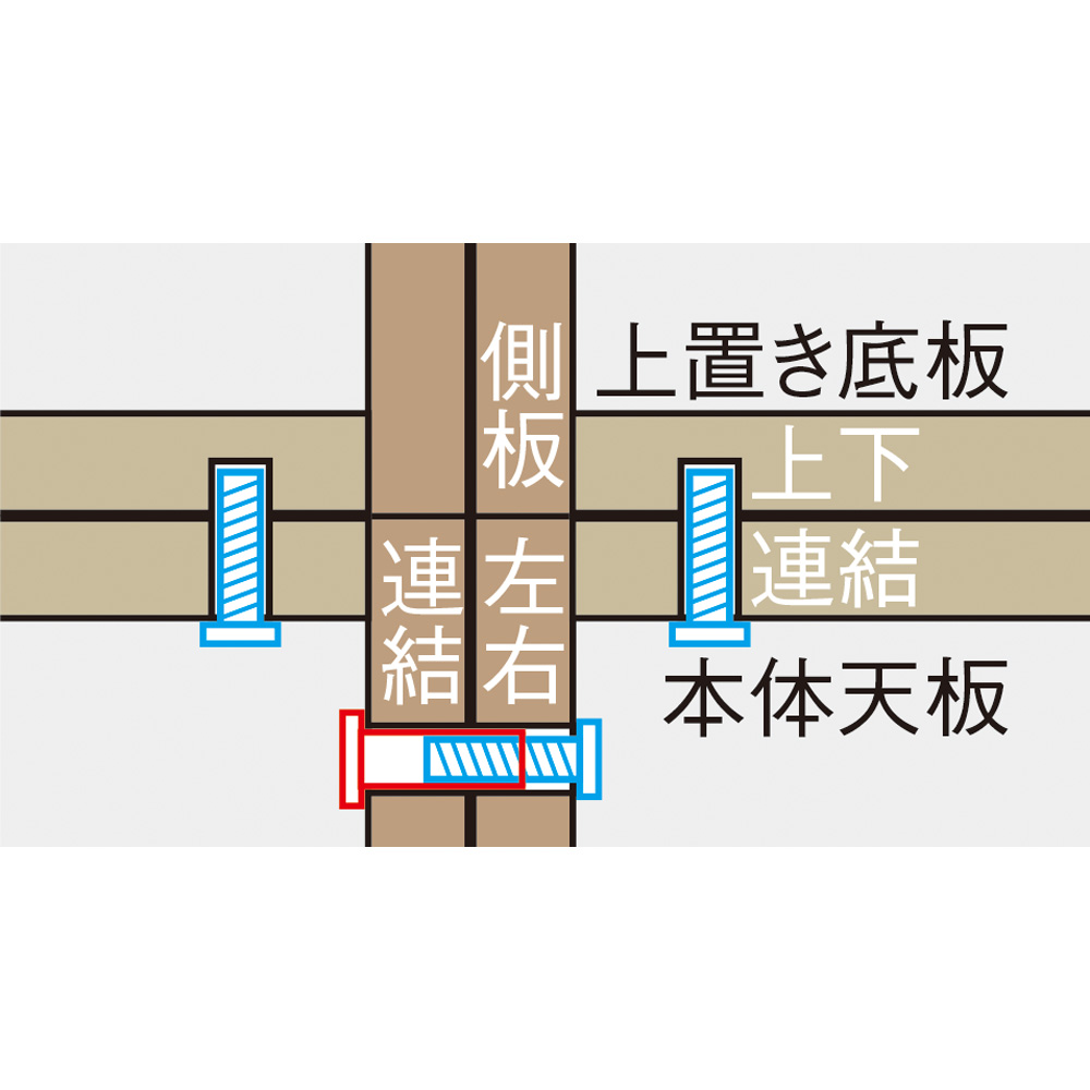 本体同士の横連結、本体と上置きの上下連結は、ジョイントネジでがっちり確実に固定。