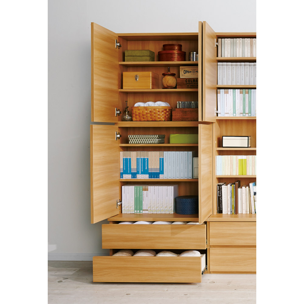 ●扉内の内寸は上下扉内とも幅70.5 高さ65cm。可動棚4枚付で3cmピッチの上段12段階、下段14段階に調節ができます。