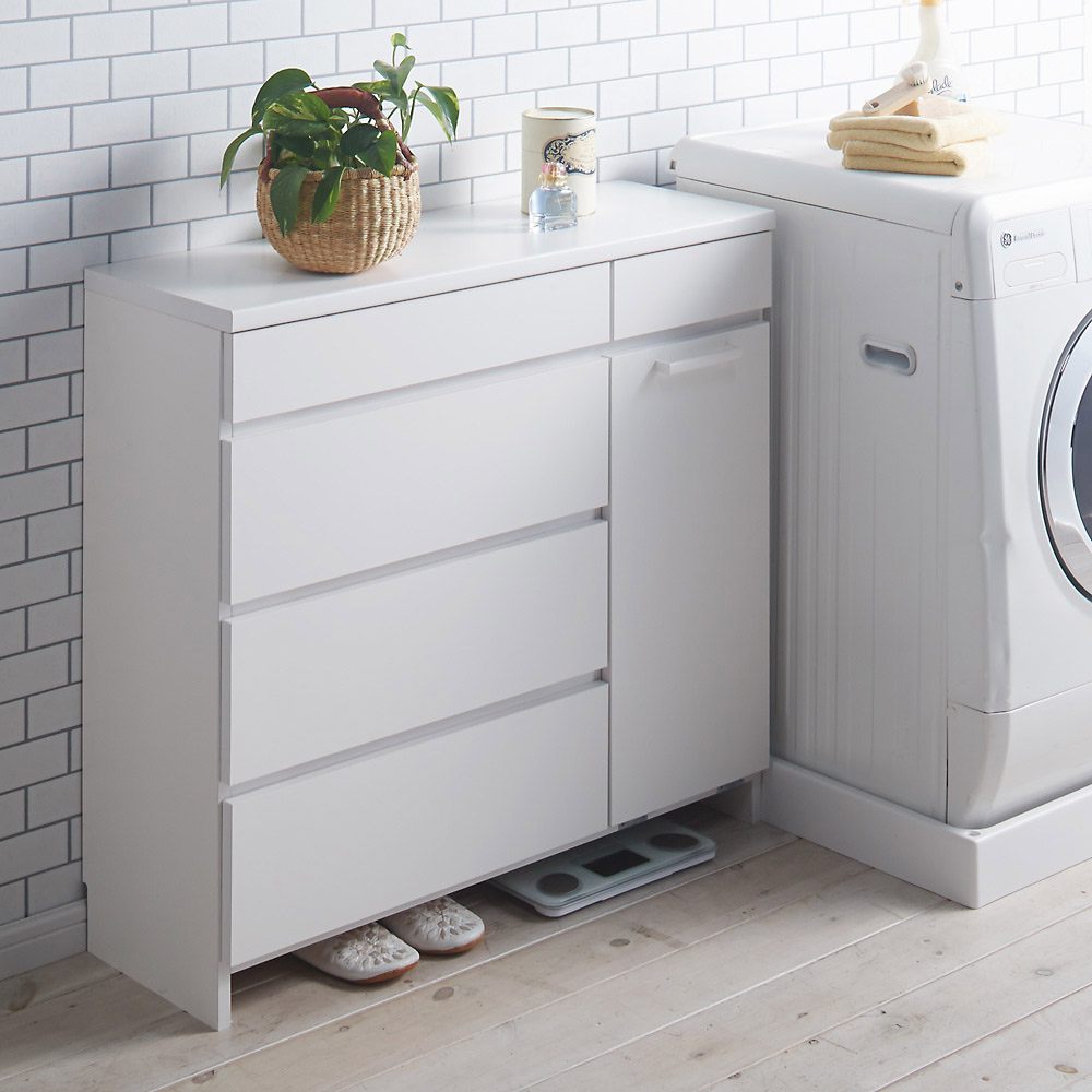 前面・天板は水に強い素材を使用しており、お手入れが簡単。洗面台や洗濯機の横でも安心です。