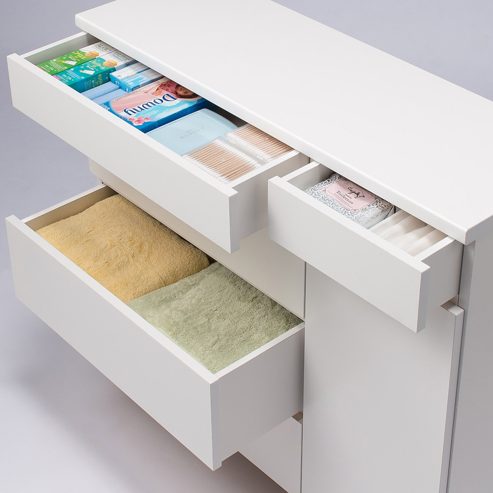 天板下の引き出しは高さ8.5cm(内寸)で、使用頻度が高いタオル、パジャマ、小型家電をしまう場所にぴったり。フラップ扉隣の引き出しは高さ16.5cm(内寸)と深めで、バスタオルや衣類、シャンプーなどの小さいボトル類を収納するリネン庫としてもおすすめ。天板にお気に入りのアイテムを飾り、インテリアとしても楽しめます。