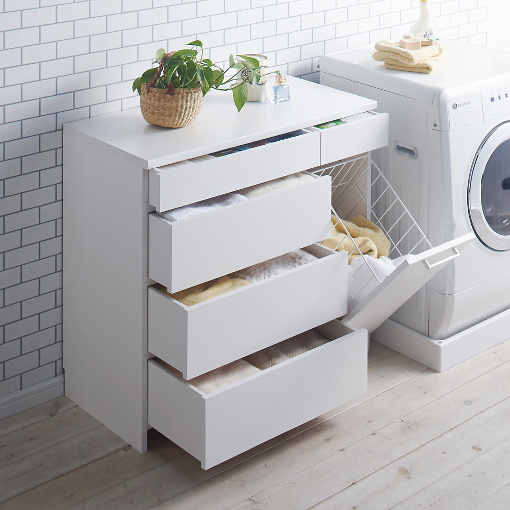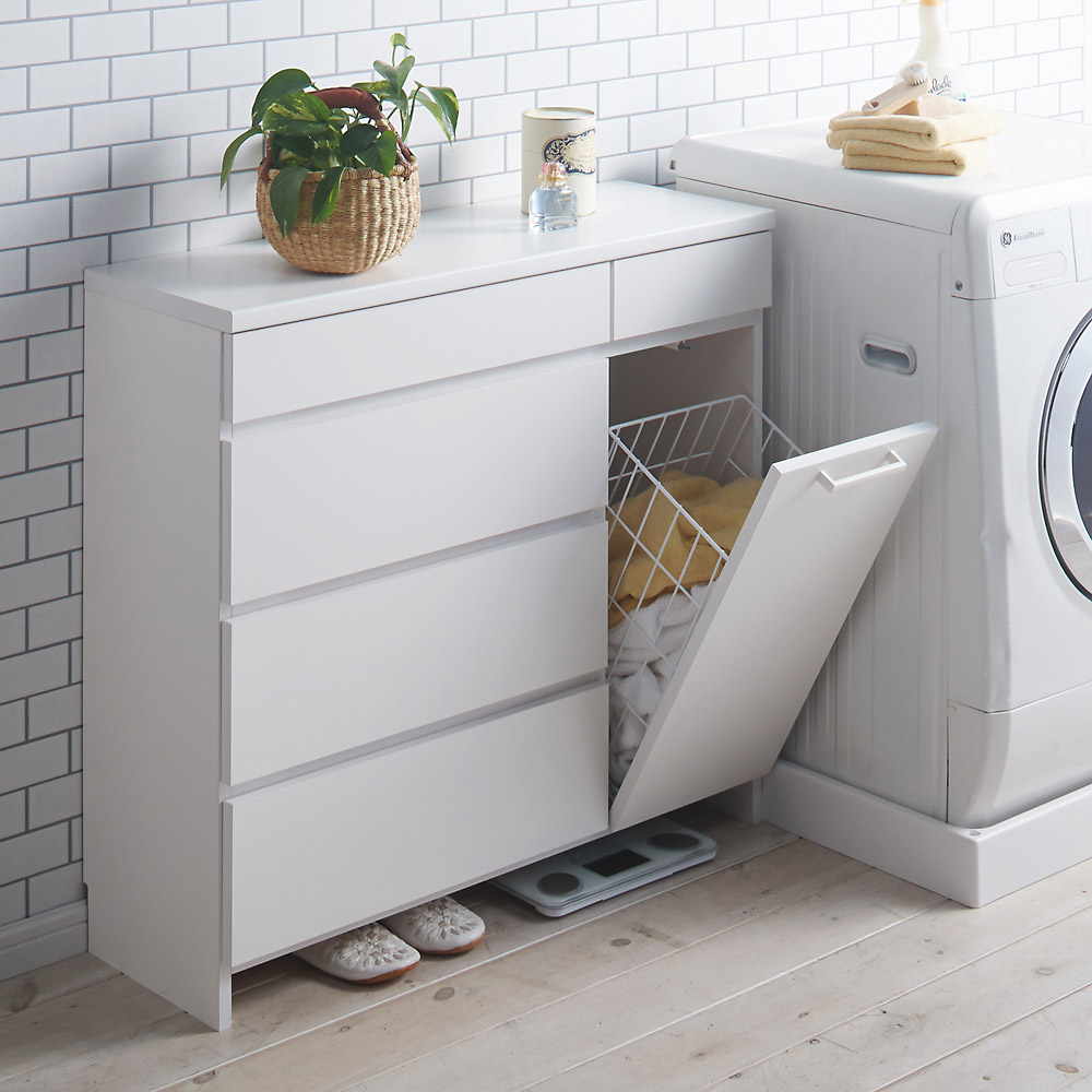 洗濯カゴを扉の中に隠して収納できる、サニタリーチェストです。生活感が見えてしまう脱衣カゴや衣類、小物をこれひとつにまとめて収納できます。扉を閉めるとホワイトのすっきりした印象が際立つ、清潔感溢れるデザインです。