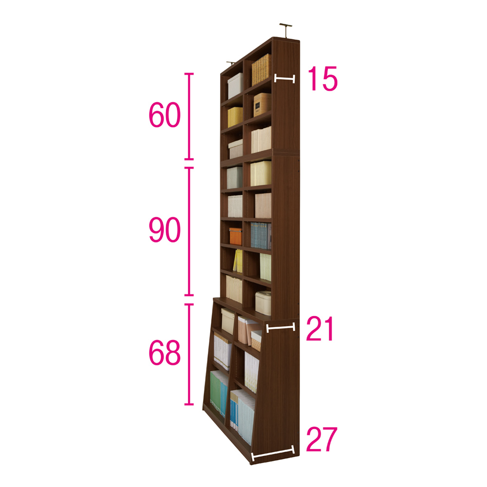 【幅90cmタイプ】幅90奥行29.5突っ張りタイプ本体高さ232.5cm、天井対応高さ238~250cm、可動棚板16枚付き