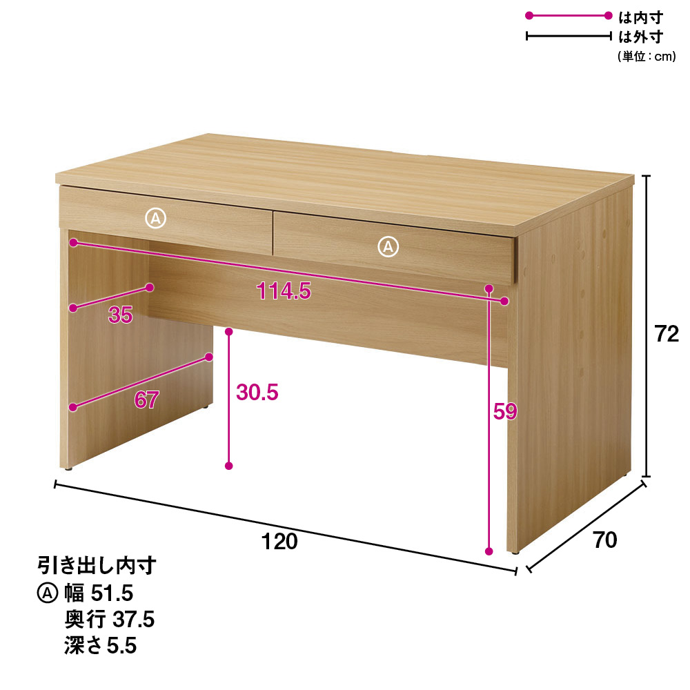 ■デスク下脚部内寸:幅114.5奥行35高さ59cm