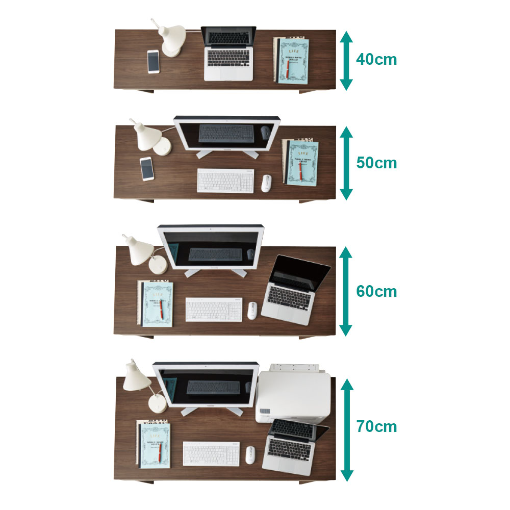 お部屋や用途に合わせて選べる全8サイズのPCデスク。薄型から奥行たっぷりのデスクまで自由に選べるので、作業内容に合わせて最適なサイズを選べます。奥行40・50・60・70cm、幅120・150cmから選べ、どんなスペースにもぴったりフィットします。