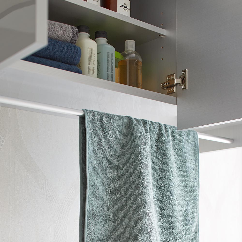 • 扉内にはハンガーバー付きでタオル掛けとして、ハンガーの置き場所としても活躍します。