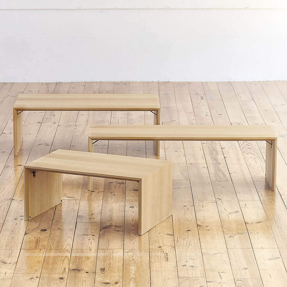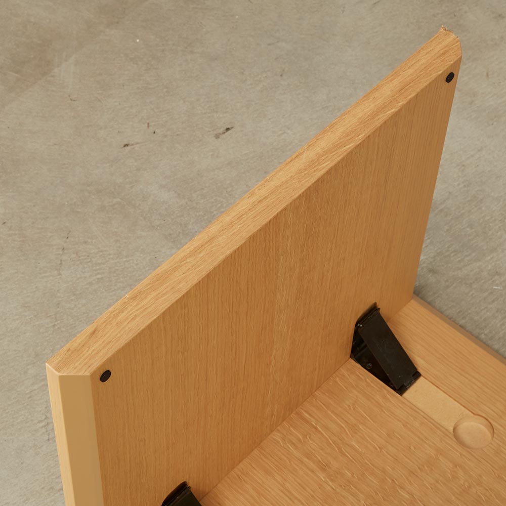 シンプルな機能美を追求したデザインは、金具一つにもこだわりを持ってすっきりミニマルな印象に仕上げました。ピタッと決まるかみ合わせの見事さは、さすが日本の職人技。デスク75はプライベート机として、またテーブル105・120はリビングテーブルとしてもおすすめです。