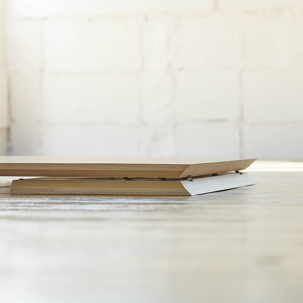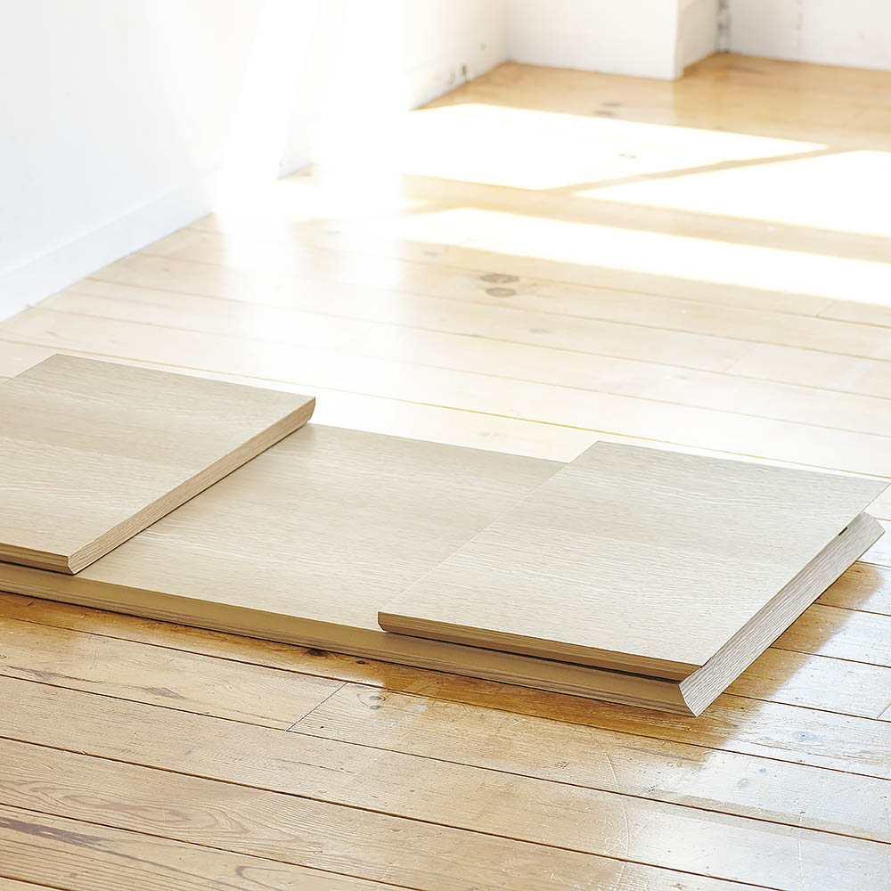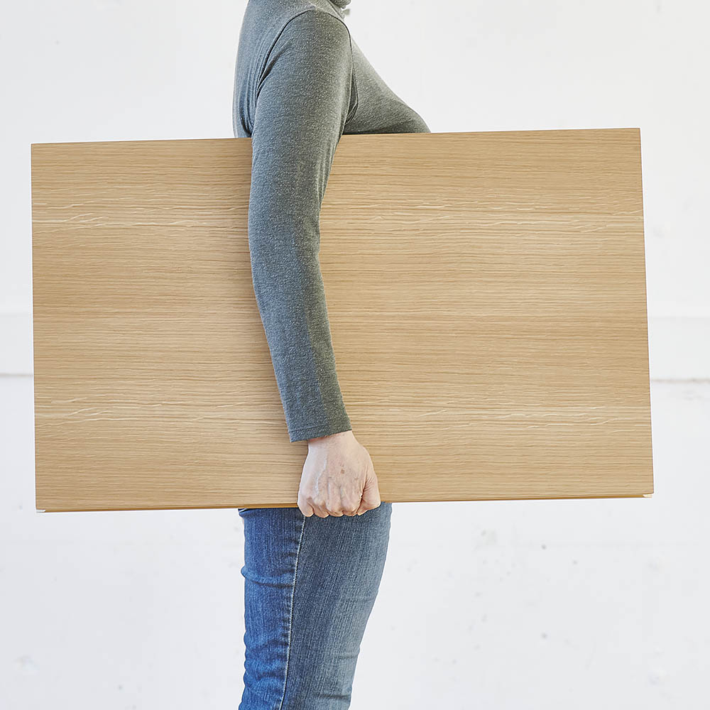 素材はウイスキー樽などにも使われるオーク天然木の合板。高級感ある柾目仕様の天板が美しく、まさに天然木の風合い。それでいて扱いやすく、出すのも、仕舞うのも、移動もラク。反りが少なく、長く大切にお使いいただけます。