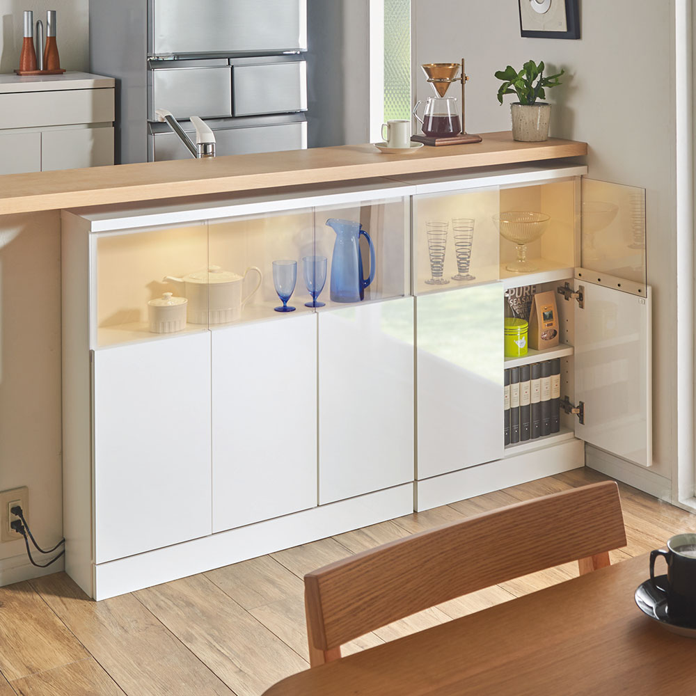 コーディネート例(ア)ホワイト 奥行20cmの薄型はカウンター下にぴったりのサイズです。食器やグラスを美しく飾ることができます。※左から幅90cm幅60cmの奥行20cmタイプになります。