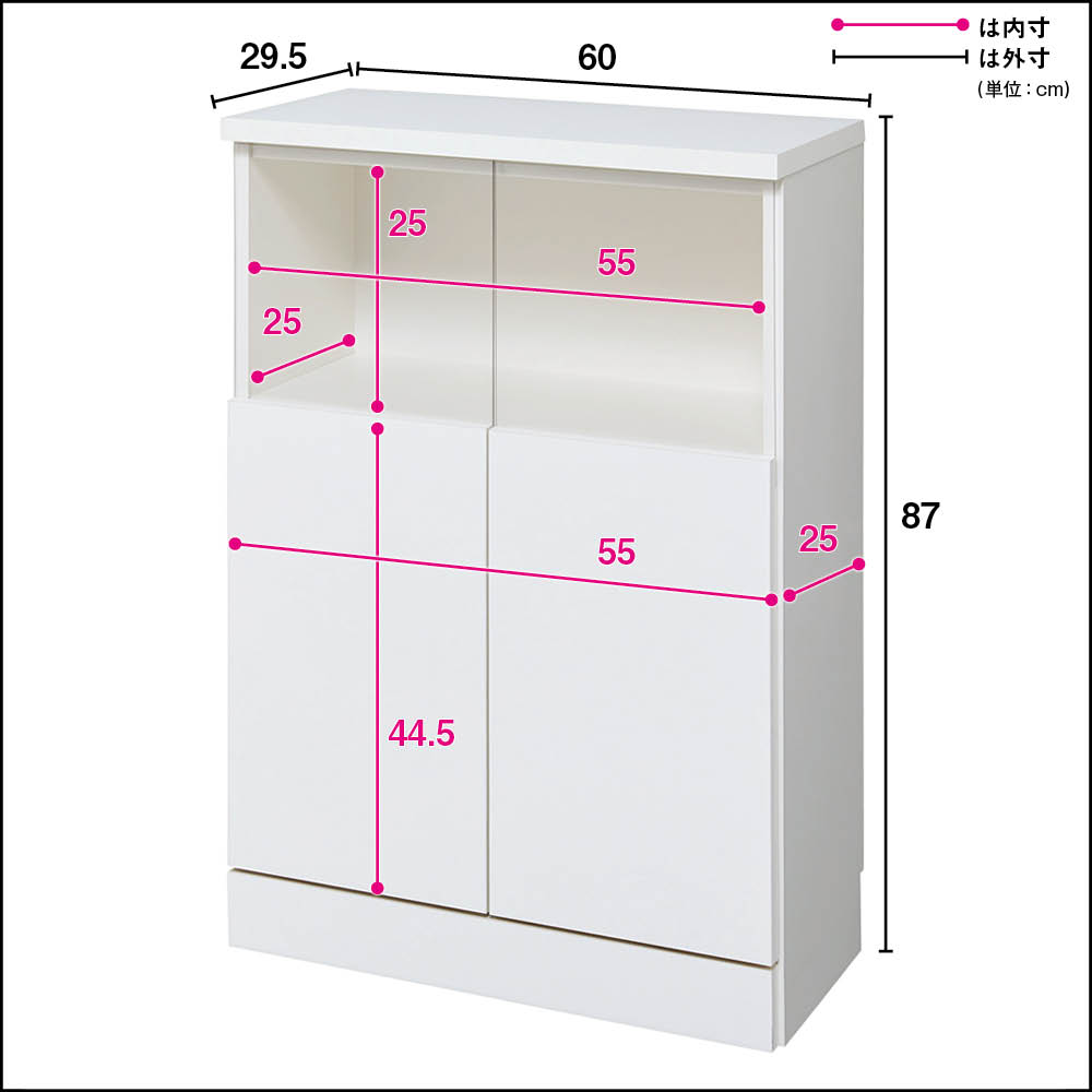 ■収納部内寸:上部扉...奥行25cm、高さ25cm、下部扉:奥行25cm、高さ44.5cm