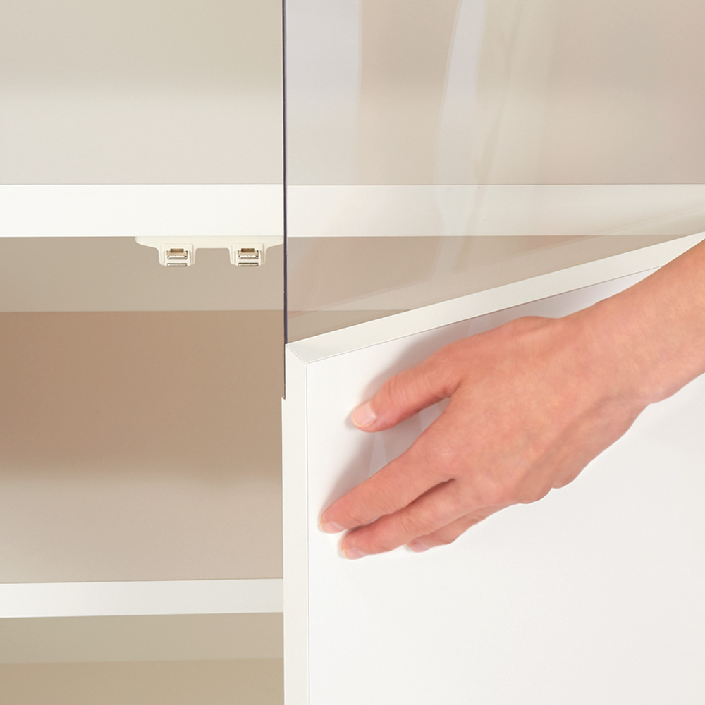 3cm間隔で高さを調整できる可動棚板が1枚付いているので、収納物の大きさに合わせて効率よく配置ができます。収納の自由度が高く、どんなアイテムも無駄なく整理整頓することが可能です。また、プッシュ式扉は軽く押すだけで手前に開くため、収納物の取り出しもスムーズ。