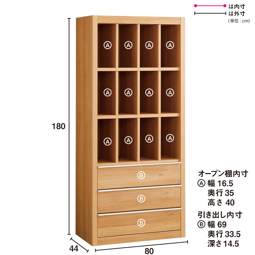 ■サイズ:幅80cm奥行44cm高さ180cm、重量56kg、引き出し奥行33.5cm