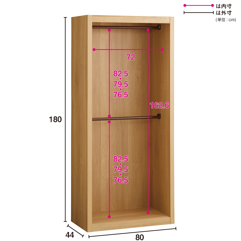 ■収納部[有効内寸]:(上段ハンガー部)幅72cm奥行40cm高さ76.5cm・79.5cm・82.5cm(下段パイプを取り外した時の高さ162.5cm)