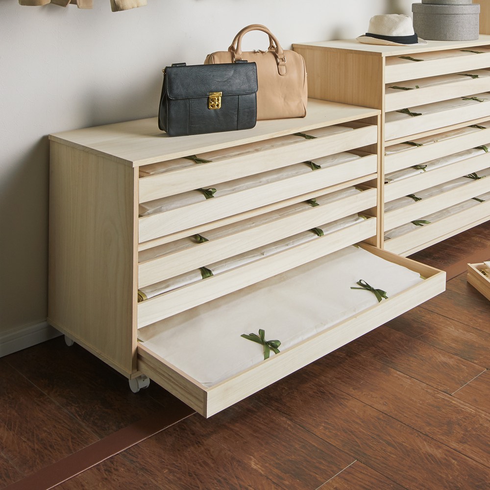●簡単に動かすことができるので、ウォークインクローゼット内でもスペースを有効活用して着物収納を増やせます●引き出さなくても収納物が見える盆収納タイプと薄手の衣類も収納できる浅引きタイプの2型をご用意