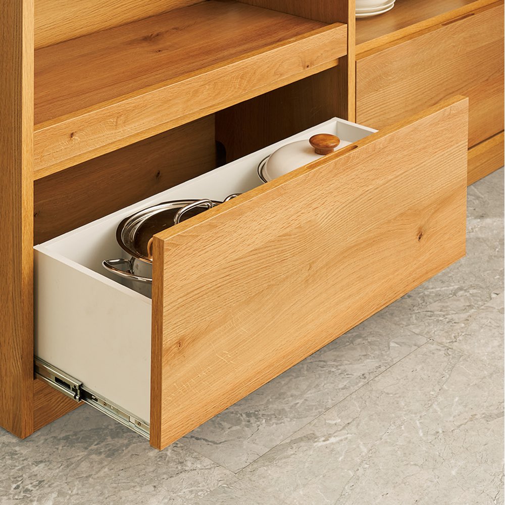 開閉しやすい引き出し下段の2杯の引き出しと家電収納部のスライドテーブルは、フルスライドレールを採用。開閉ラクラクで、奥まで見渡せる仕様に。引出し収納部は、有効高さ26cm。高さのあるボトル類も収納できます。また、内部は化粧仕上げなのでお手入れも簡単。