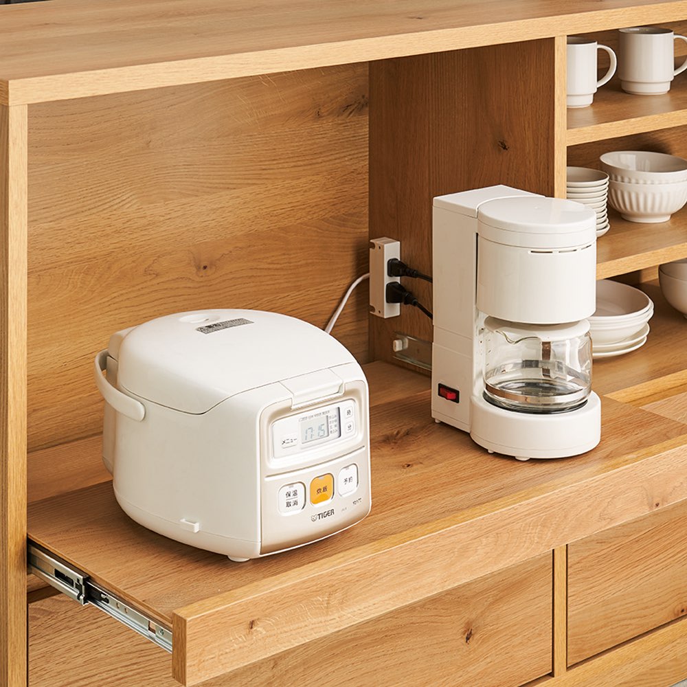 スライド仕様・コンセント付きの家電収納部家電収納部は2口コンセント付きなので、炊飯器や電子ケトルなどの収納にも便利。(家電収納部奥行29高さ42cm)