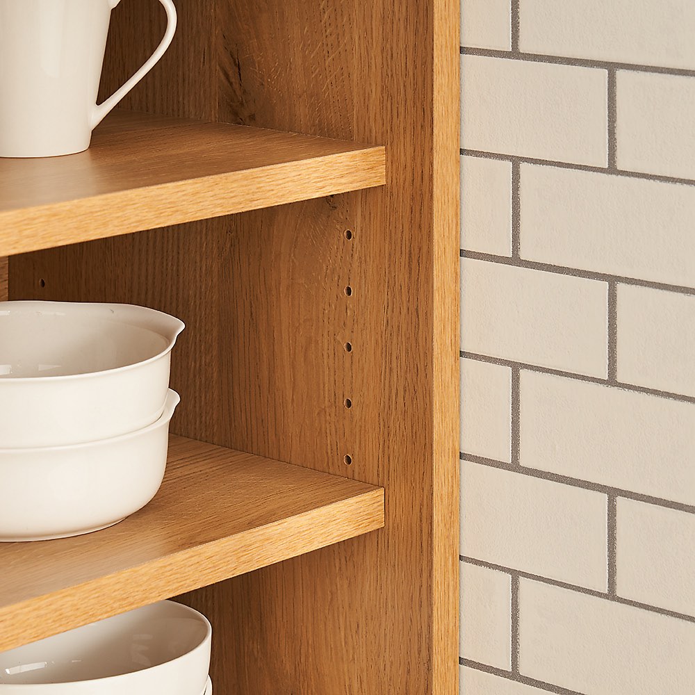 (イ)ナチュラルオーク【収納側】裏側はたっぷり収納!調理台にも。棚は3cm間隔で可動します。 ※写真は幅120cmタイプです。