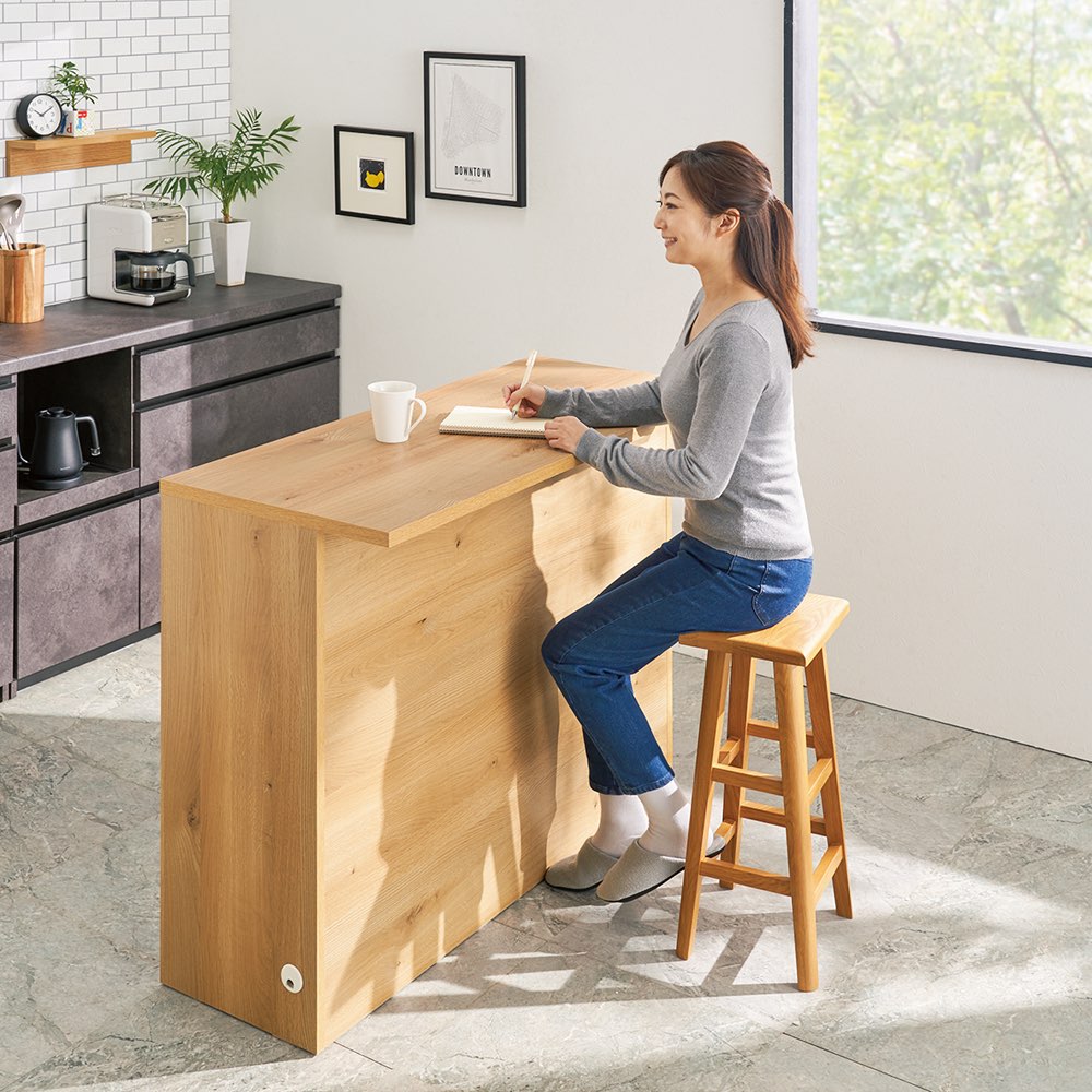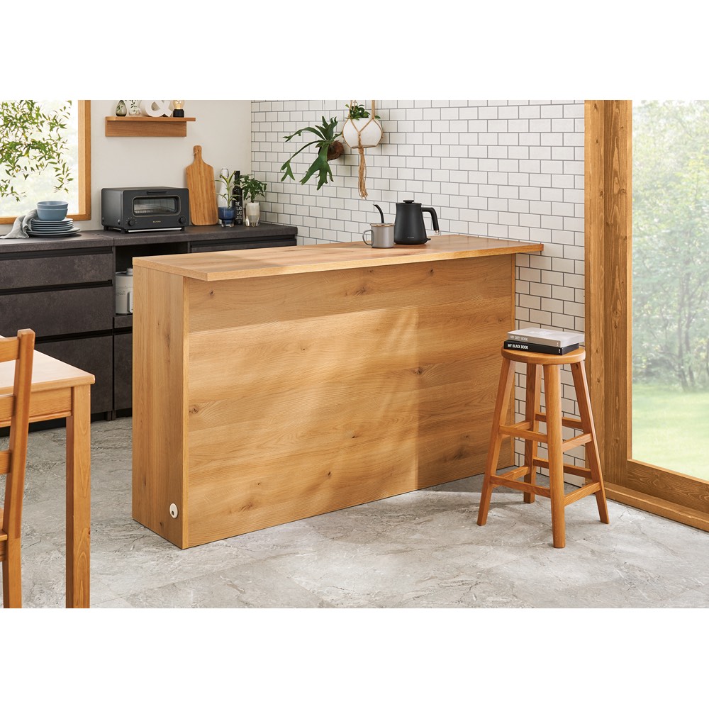 ナチュラルオーク幅90cm(お届けはカウンターのみ)置くだけで、ダイニングがカフェ風にまるで造り付けのように美しいキッチンカウンター。背面を間仕切り仕上げにし、キッチンとダイニングの仕切りとしても使用できるようにしました。幅90cm・120cm・150cmの3サイズをご用意。
