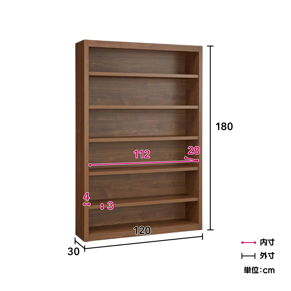 ■60、90、120cmからお選び頂けます。高さはすべて共通で180cm、奥行は30cmとなっております。■カラーはウォルナット柄とオーク柄の2色。