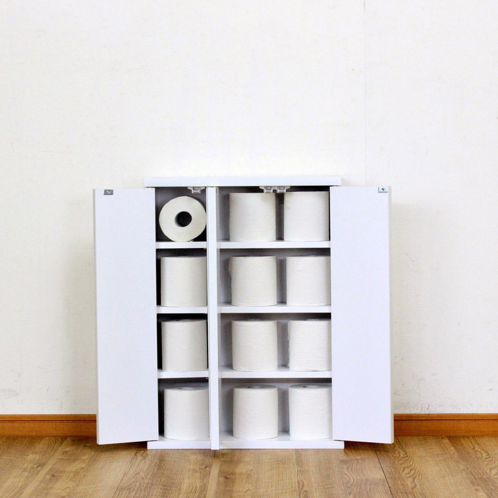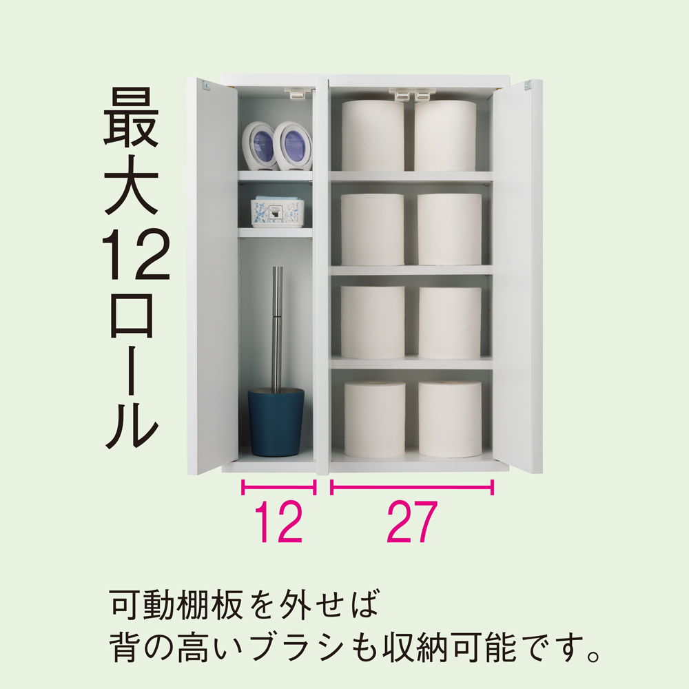 (ア)ホワイト トイレットペーパーを最大12ロール収納できます。棚は取り外しできるので、長さのあるブラシや掃除道具もしまえます。