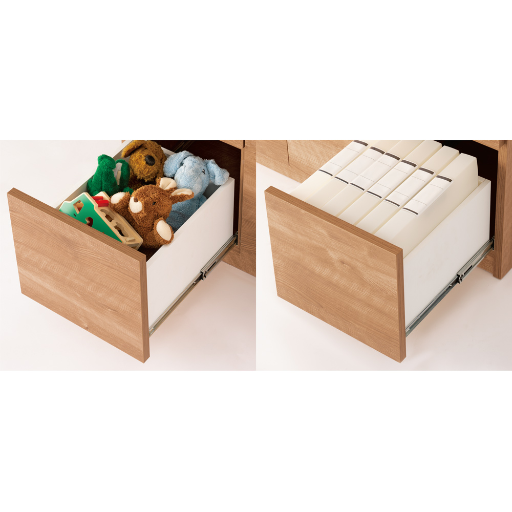 ・最下段は内寸高さ25cmの深引き出し。丈夫な箱組仕様で、おもちゃなどかさばる物やA4フォルダもすっきり片付きます。