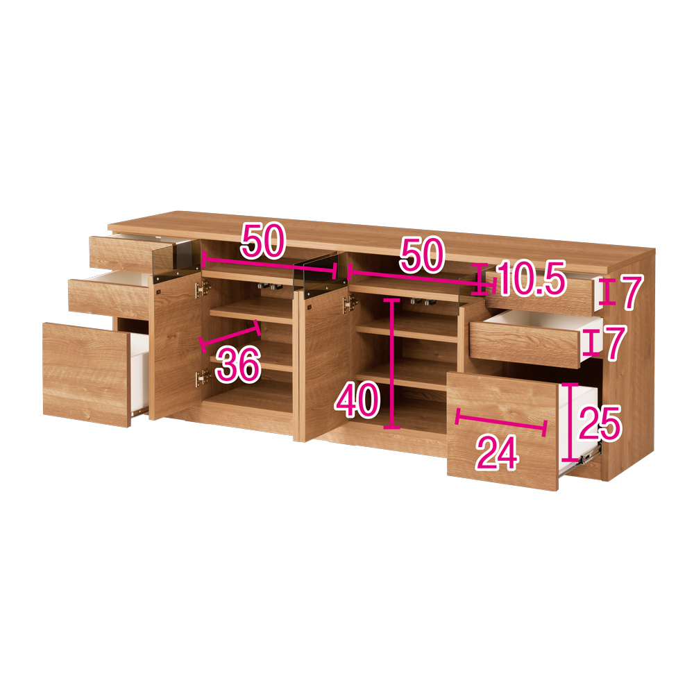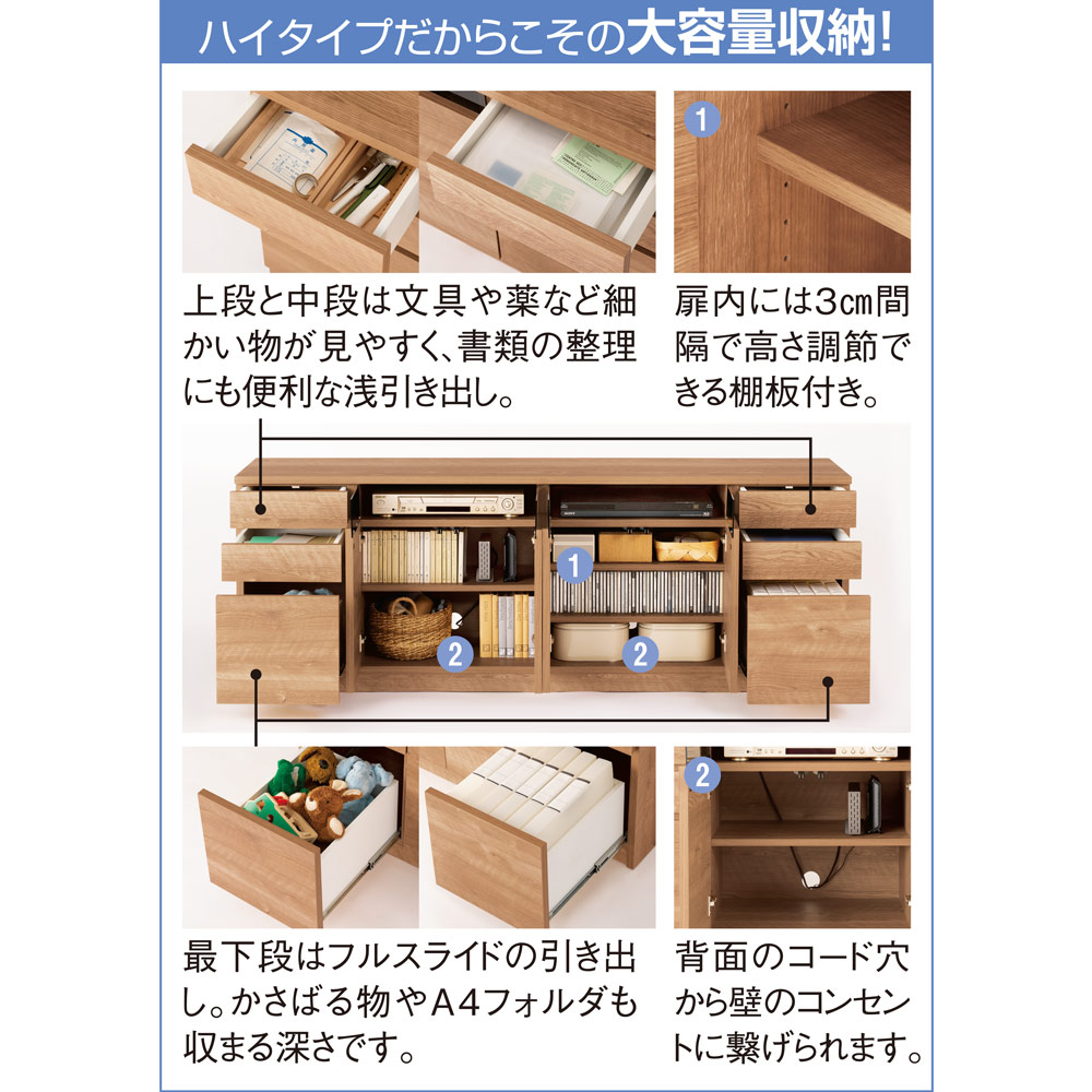 ・扉収納部の左右には引き出しを3杯ずつ配置。計6杯の引き出しはA4サイズが納まるリビングチェスト代わりになり、大活躍。・お子さまの遊び道具やペット用品など、散らかりがちな物がきちんと片付きます。