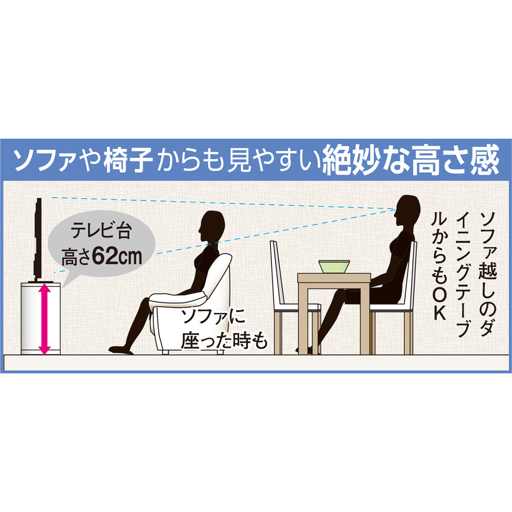 ●ダイニングチェアやソファに座っても自然な目線でテレビが視聴ができる高さ62cmです。