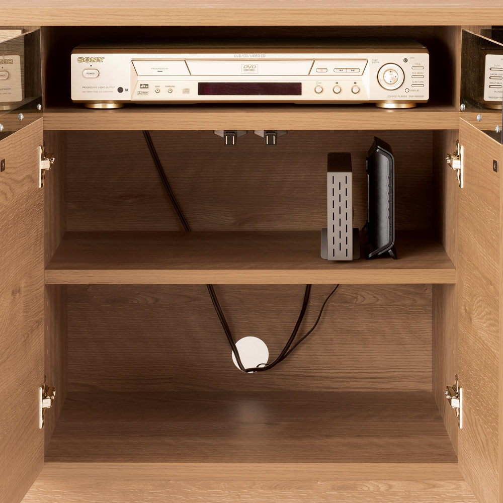 ・両開きの扉が2つ並んだワイドな収納棚にはデッキやモデム類、ゲーム機はもちろん、文庫本やブルーレイなどもたっぷり収まります。・最上段(固定棚の上)は録画デッキ置きに。上部前面はグレー色のガラス仕様で、扉を閉じたままでもリモコン操作が可能です。