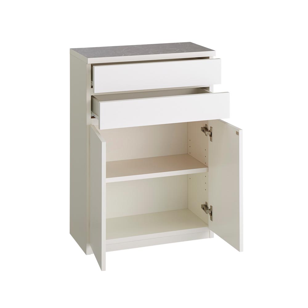 ◆扉収納タイプは浅引き出し1段つき。引き出しにはカトラリーやペーパーナプキンをしまって、下の扉にはお皿や食品ストックを賢く収納。